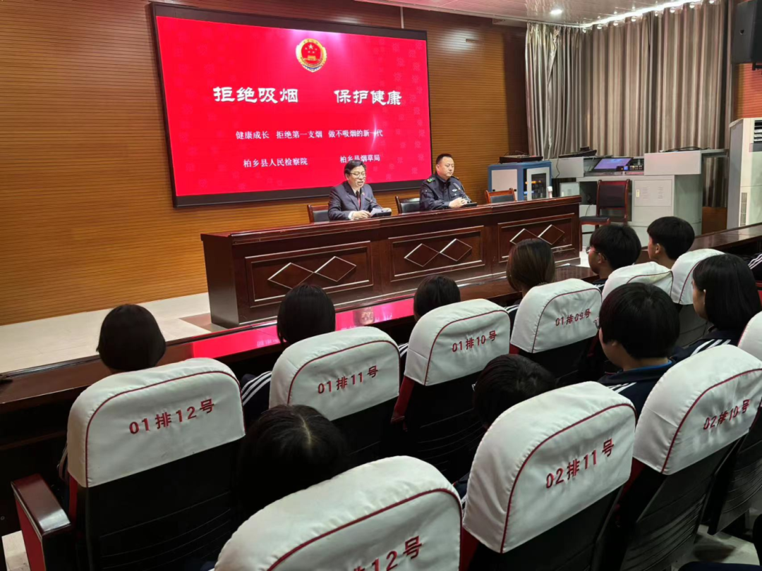 柏乡县人民检察院副检察长郝占川结合《未成年人保护法》、《电子烟管理办法》,通过展示PPT、发放宣传资料、与同学们“一问一答”等形式,向同学们介绍不得向未成年销售香烟(含电子烟)的法律规定、什么是电子烟、吸食电子烟对未成年人身心的危害等常识,并通过以案释法,警醒学生们提高防范意识,远离烟草制品,构建和谐温馨的“无烟”校园!